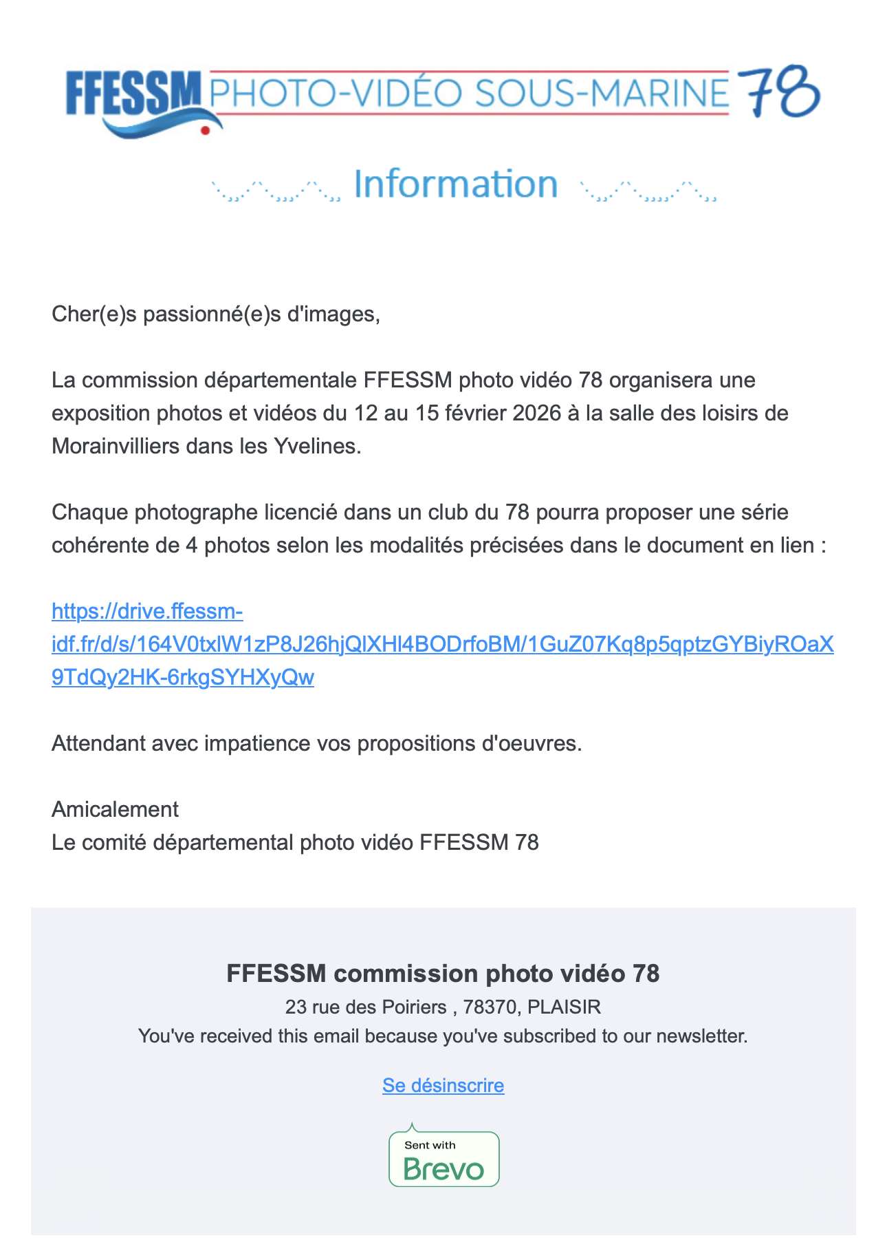 Communication de la Commission Départementale FFESSM photo vidéo 78 concernant l'organisation d'une exposition photos et vidéos en février 2026 à Morainvilliers.