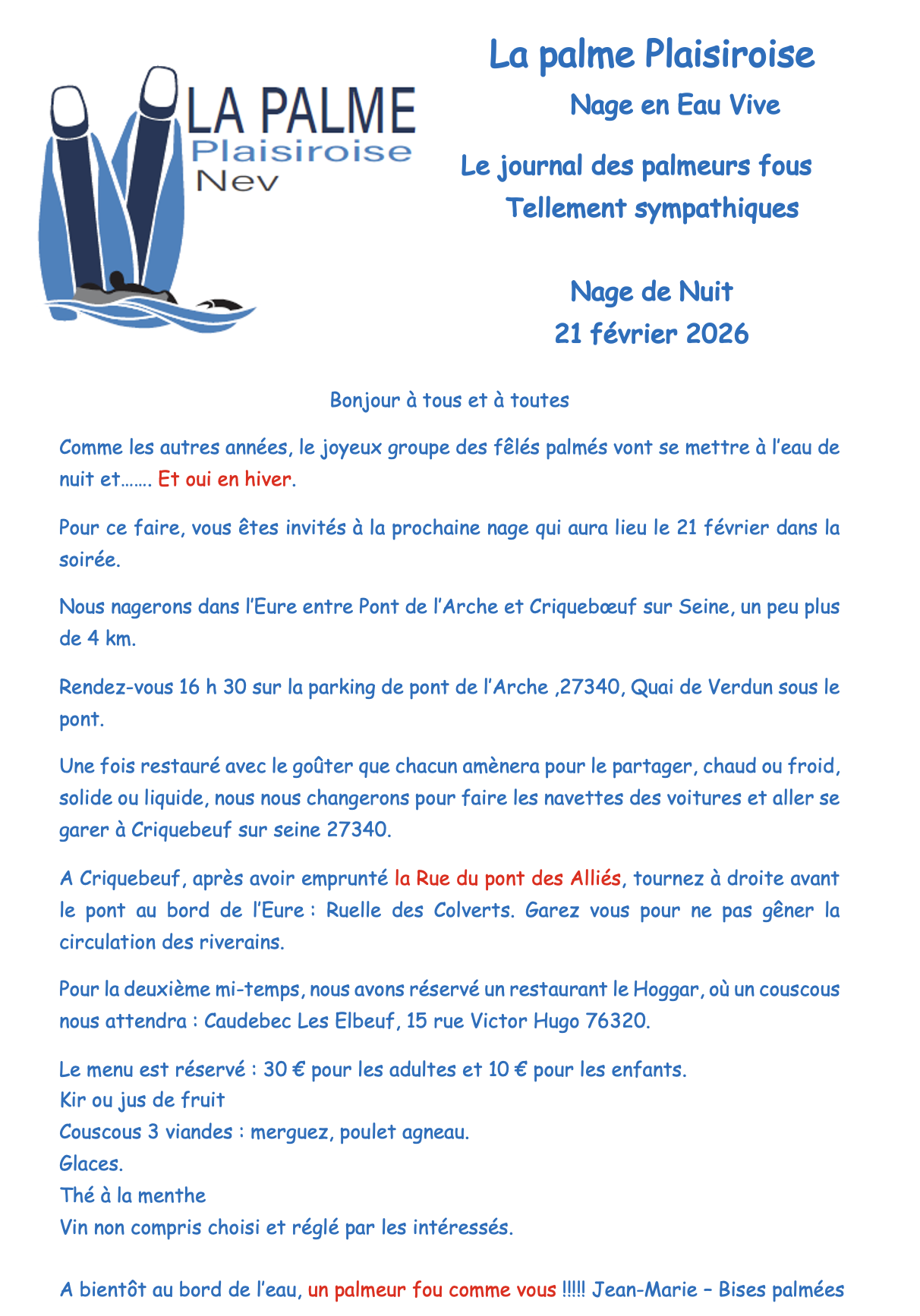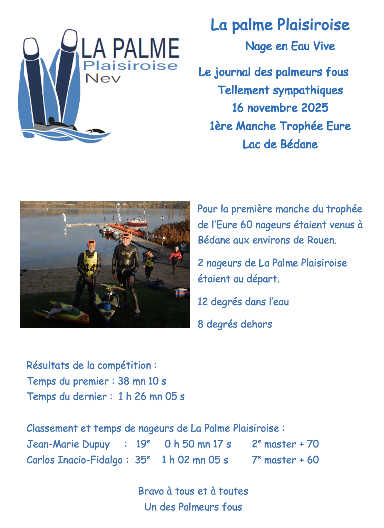 Une nouvelle saison démarre, votre club préféré : La Palme Plaisiroise vous invite à Cergy le 12 octobre 2025 pour la traditionnelle nage du Challenge Gérard Ridet - Trophée Téo.